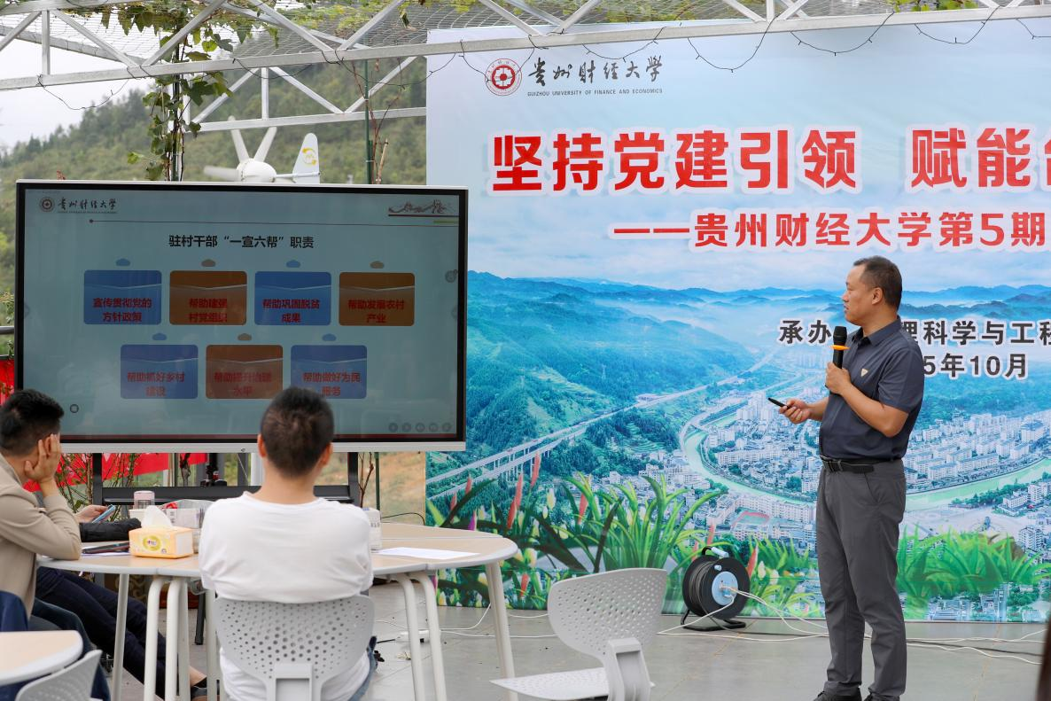 主题发言环节,信息学院党委副处级专职组织员王游滨、法学院党委副科级专职组织员向涛、文学院党委副科级专职组织员周绪忠等3位担任过驻村干部的组织员先后分享了各自在驻村期间的实践与感悟;管理科学与工程学院党委委员、副院长梁龙围绕“发挥专业优势助力台江乡村产业振兴”分享了经验做法;校党委组织部组织科科长李泽庆介绍了学校抓党建促台江乡村振兴基本情况。