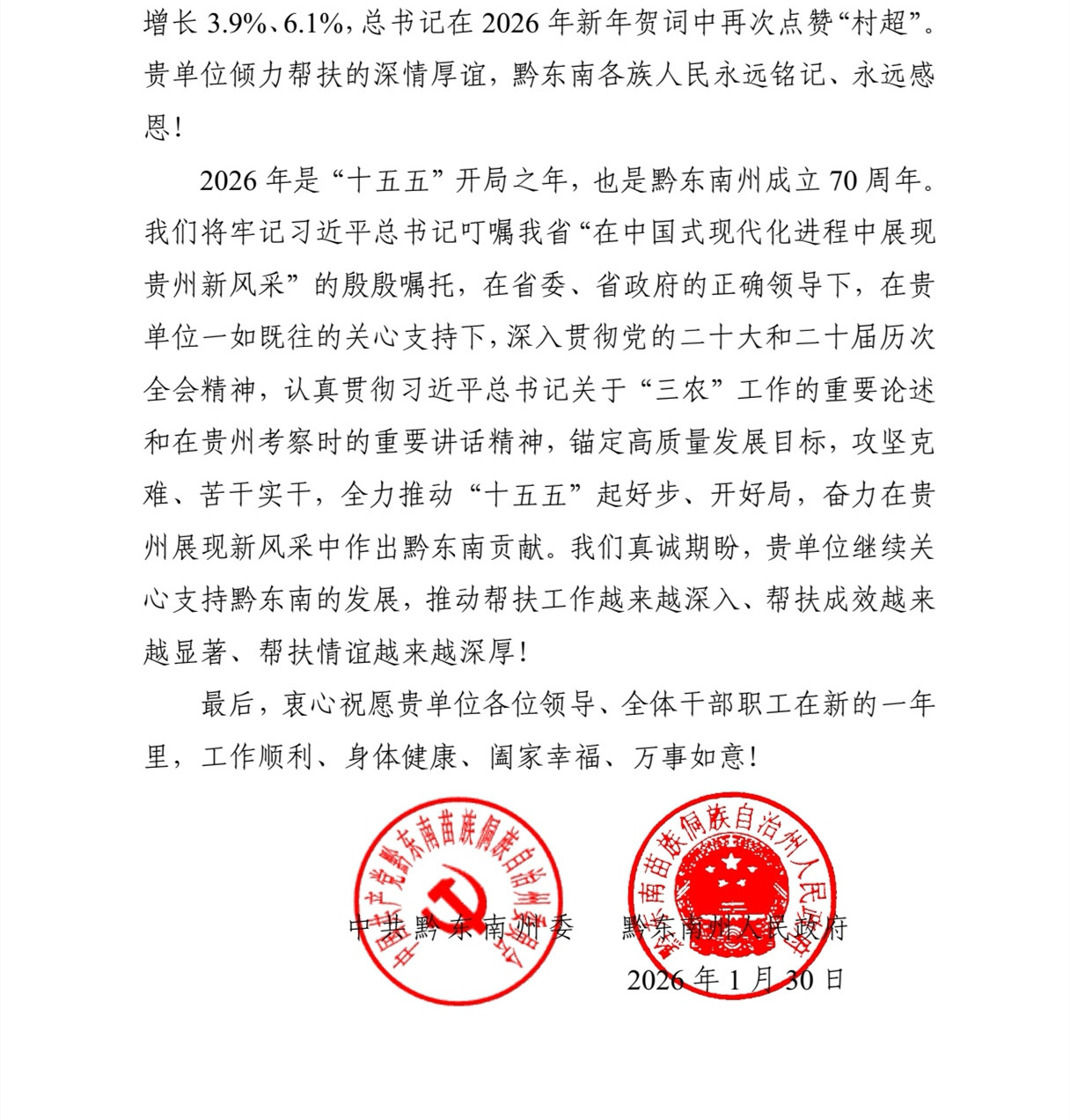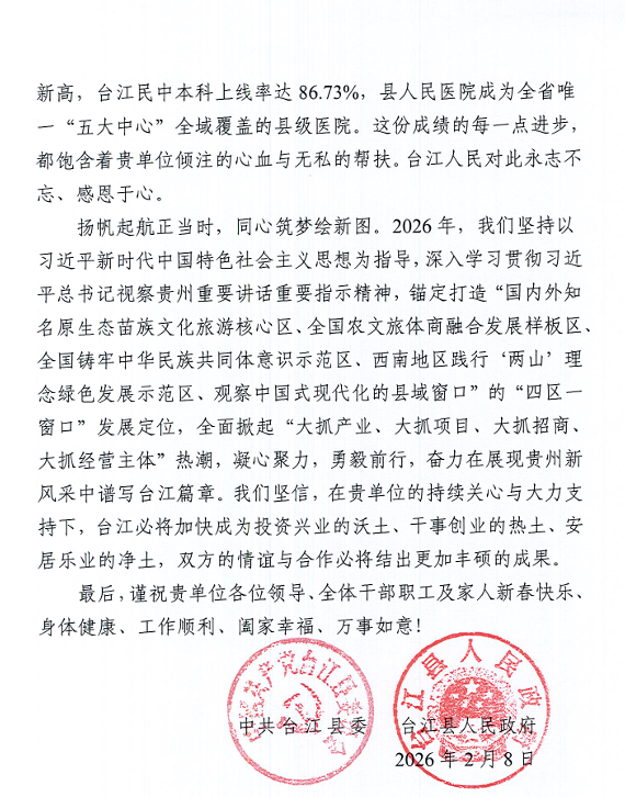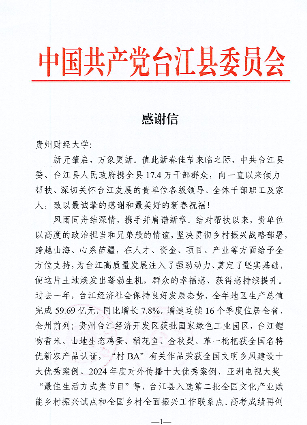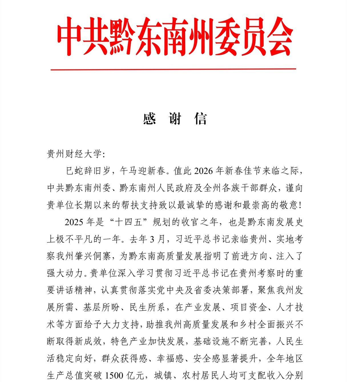 近日,黔东南州委、黔东南州人民政府向我校发来感谢信,信中对我校长期以来的帮扶支持致以诚挚的感谢,并向全体教职工致以美好的祝福。